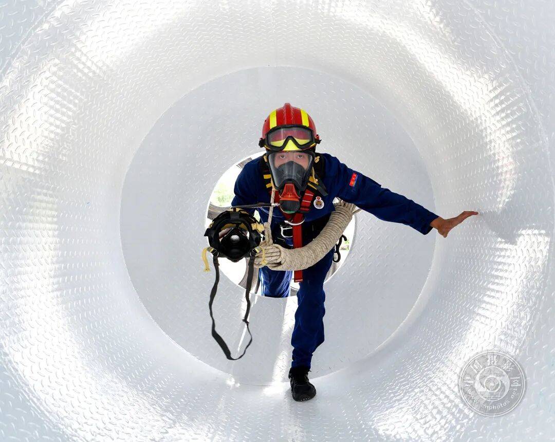 2021年6月拍摄于福建福清核电有限公司 图为核电消防武警身着专业防护装备,在模拟管道场景开展训练。他们以严谨姿态,锤炼应对核电设施潜在风险的技能,为核电安全筑牢“防火墙”,每一次训练都是守护核安全的庄严承诺。