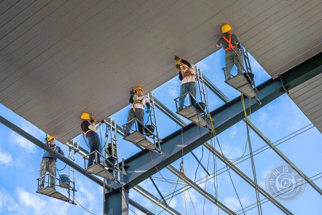 2023年8月15日拍摄于河南省鹤壁市金山工业园区项目工地。建筑工人正在安装车间顶瓦,这是一项高空作业,在做好安全防护的同时还要步调一致做好各项细致环节。