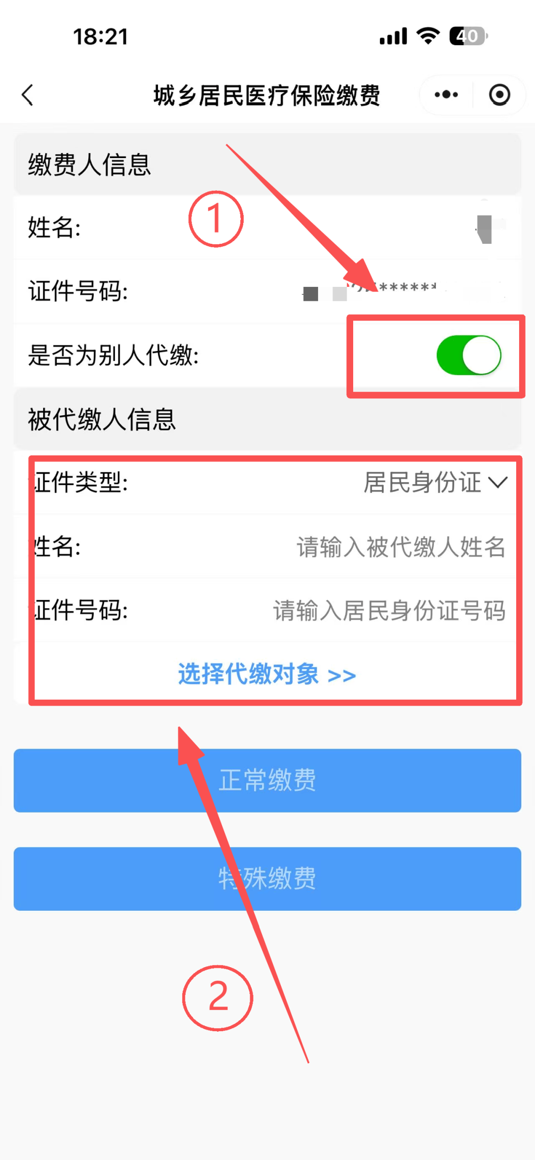 在微信主页搜索“河南税务”小程序,进入后选择【居民医疗保险缴费】把“是否为别人代缴”点开,在下方填写代缴对象的信息,再点击正常缴费即可