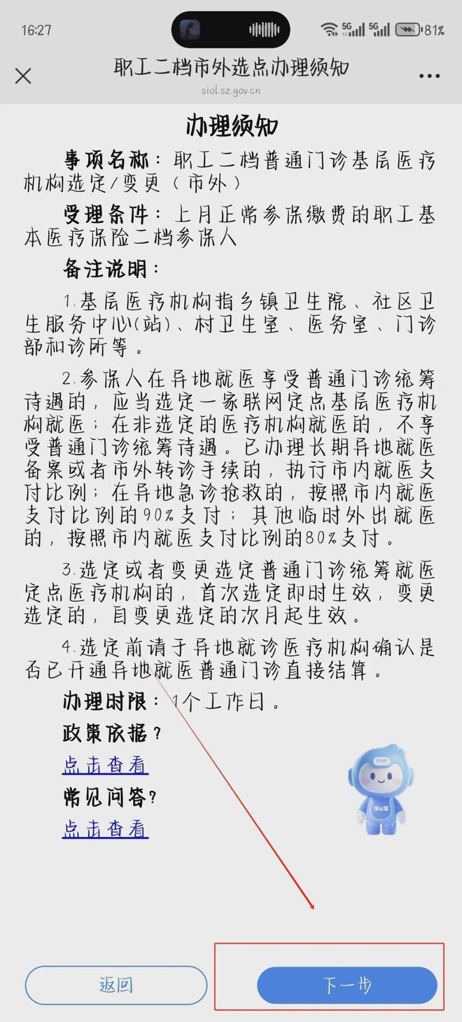 第二步:点击“市外选定/变更”(职工二档选点/变更),阅读办理须知后点击“下一步”;