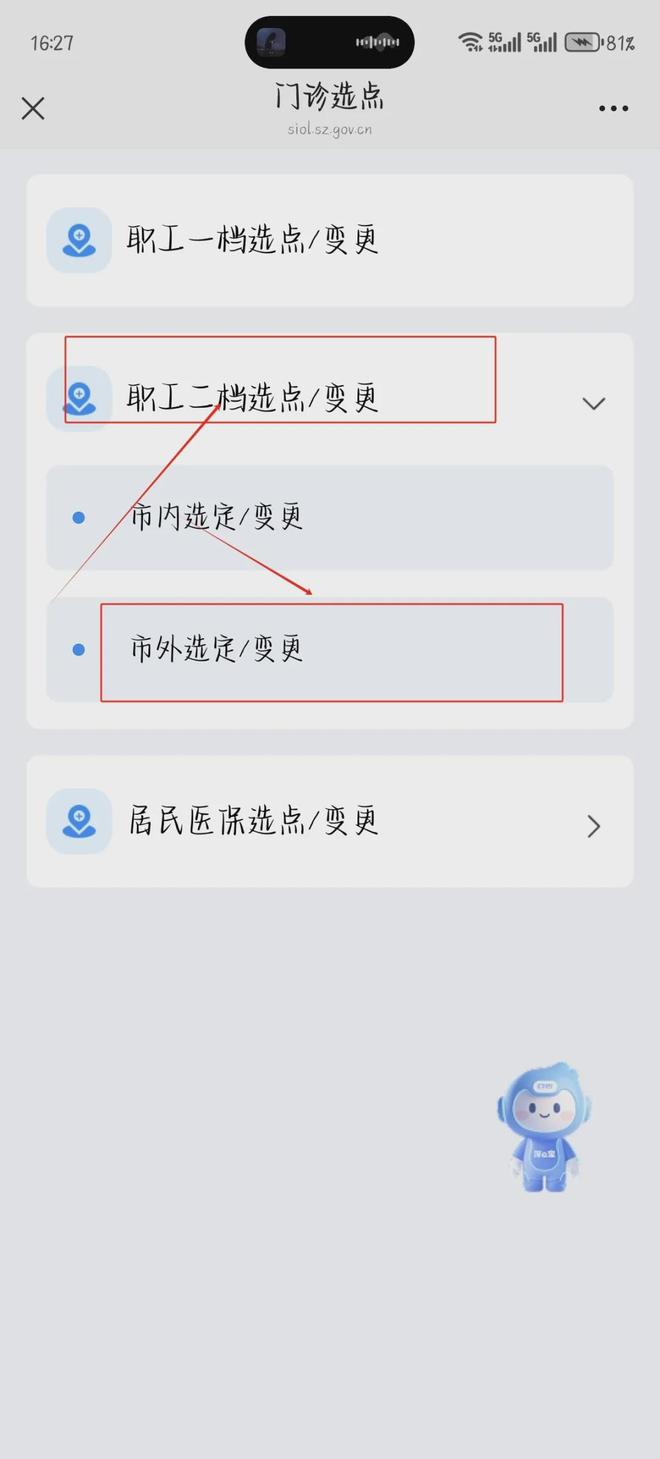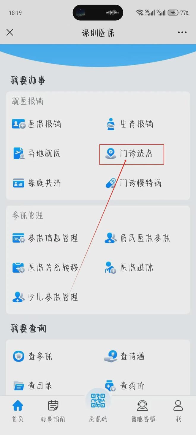 第一步:进入“深圳医保”,点击“掌上办事”,登录系统后,选择“门诊选点”;